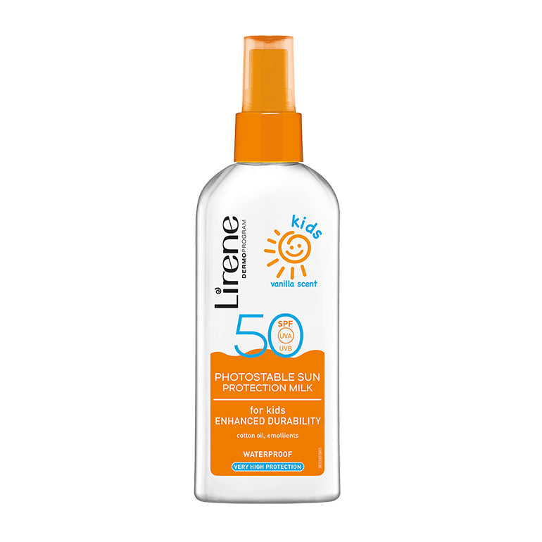 LIRENE SUN - Lapte de corp fotostabil pentru copii, cu factor ridicat de protectie solara SPF 50 si parfum de vanilie, 150ml